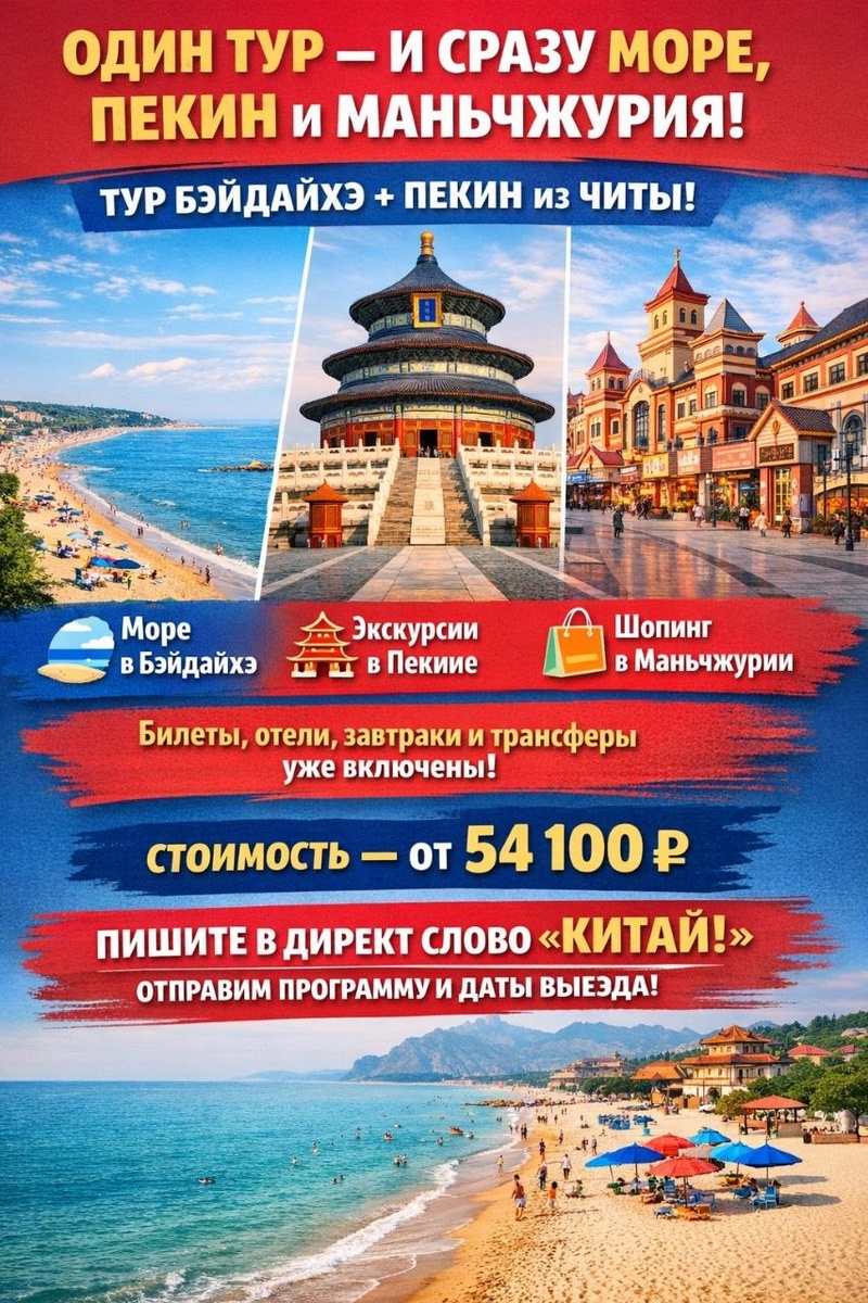 💯💯💯💯 Тур в Китай: море + Пекин в одной поездке 🧧 Если вы давно искали тур в Китай из Читы, где можно совместить отдых на море и экскурсионную программу, — это именно он! Открываем набор на популярный маршрут Бэйдайхэ + Пекин + Маньчжурия — идеальный вариант для тех, кто хочет не просто отпуск, а настоящее насыщенное путешествие в Китай. Почему этот тур так любят туристы? Потому что здесь есть всё: 🏖 отдых в Бэйдайхэ на Желтом море 🏯 экскурсии в Пекине 🛍 шопинг и остановка в Маньчжурии 🚂 удобный маршрут ✅ уже включённый проезд, проживание и трансферы Это отличный вариант, если вы хотите: — поехать в Китай на море — увидеть Пекин и достопримечательности Китая — выбрать готовый тур из Читы без лишних хлопот — отдохнуть комфортно и по понятной цене 🗓 Программа тура: — 7 дней / 6 ночей в Бэйдайхэ — 4 дня / 3 ночи в Пекине — 2 ночи в Маньчжурии 🎣 Стоимость тура в Китай на человека: — до 18.06: 54 100 — 55 100 ₽ — с 21.06: 56 100 — 57 100 ₽ — с 25.06 по 02.07: 62 100 — 63 600
