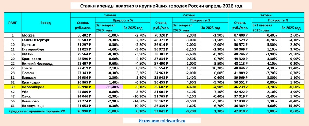 ⬇️ Темпы падения арендных ставок в Новосибирске увеличились в первом квартале 2026 года в 8(!) раз