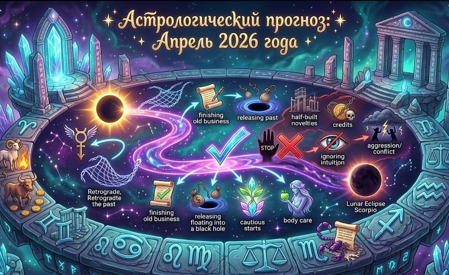 🌌 Главные астрологические события апреля 2026 Меркурий ретрограден (первая половина месяца, завершается 11 апреля). Самый важный фон. Коридор затмений (открылся в конце марта — Солнечное затмение в Овне, закроется Лунным затмением в Скорпионе 18 апреля). Венера и Марс в движении (сменят знаки в середине и конце месяца). ✨ Общие тенденции апреля: что стоит делать ✅ Стоит сделать: - 🗓 • До 11 апреля — завершать, а не начинать. Используйте ретроградный Меркурий для ревизии, чистки долгов (финансовых и моральных), возврата старого. - 📦 • Отличное время вернуть должок, забрать забытую вещь, переписать черновик. - 🌑 • В период затмений (весь месяц, пик 18.04) — отпускать. Лунное затмение в Скорпионе вытаскивает на поверхность то, что мешало жить годами. - 🕯 • Стоит: простить, признать свои темные стороны, провести ритуал «прощания» с вредной привычкой или токсичным человеком. - 📈 • После 12 апреля — осторожные старты. Когда Меркурий развернется, можно возобновлять проекты, «замор