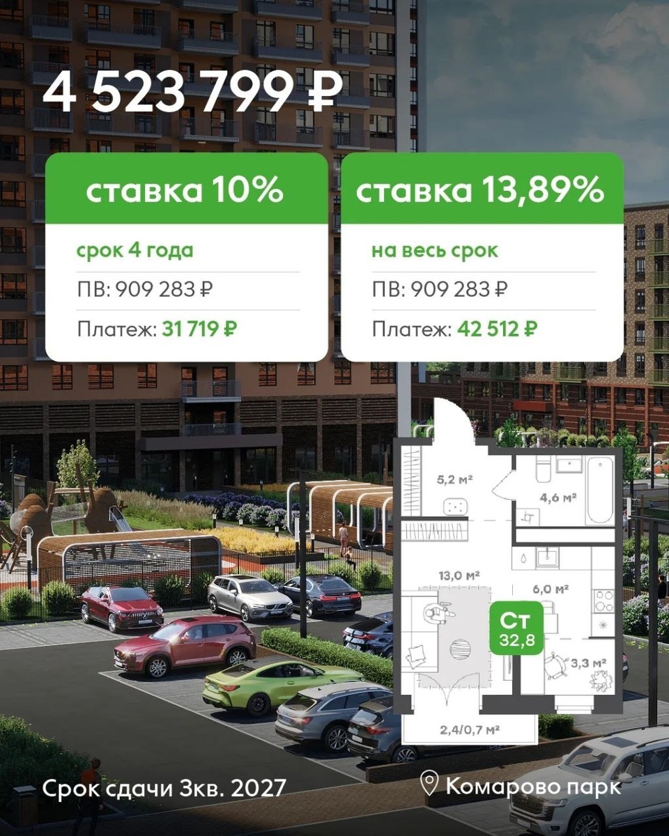 🔥 📍 Комарово парк Субсидированная БАЗОВАЯ ипотека без удорожания + скидка 🔴 Студия 32,8 м2 Стоимость квартиры: 4 523 799 Ставка 10 (4 года) : 31 719 Ставка 13,89% (весь срок) : 42 512 🔴 1 ком 39м2 Стоимость квартиры: 5 256 825 Ставка 10% (4 года): 36 859 Ставка 13,89% (весь срок): 49 401 🔴 2ком 56,3 м2 Стоимость квартиры: 6 484 611 Ставка 10% (4 года): 45 468 Ставка 13,89% (весь срок): 60 939 🔴 Срок сдачи 3-й квартал 2027 г. 🔴 В большинстве случаев, если мы видим субсидированную ставку (сниженную), то это подразумевает увеличение стоимости квартиры. В данном случае, цена, ставка и платеж очень приятные) Если рассматриваете покупку квартиры и не подходите под условия семейной ипотеки, рекомендую присмотреться Мои услуги при покупке квартиры в новостройке без комиссии. Бесплатная консультация +7-912-920-3795 или @Nikita_ab Мой канал в МАКС