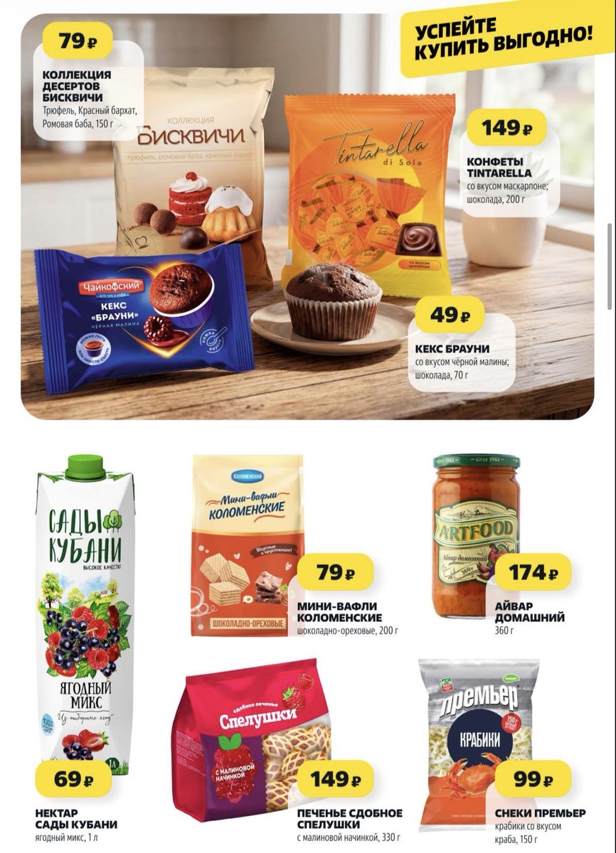 Начну сразу со страницы из продуктового ассортимента магазина. Из новинок разные сладости, снеки и сок 👇