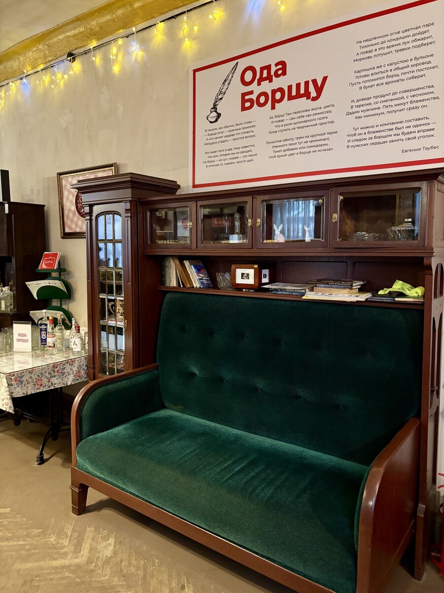 Как-то на выходных после прогулки в Екатерининском парке очень хотелось зайти куда-нибудь согреться, так как погодка была просто брр 🥶 И при этом еще хотелось не сильно потратиться, а для Пушкина это задача со звездочкой, как понимаете. Но мы нашли такое место! И оно буквально через дорогу от Екатерининского парка. Фишка этого кафе-одно блюдо в меню! Здесь подают только борщ! Бесплатно к борщу подают сметану и хлеб! Есть борщ сегодняшний или вчерашний, также постный. Ну и еще 2 позиции борща и бутеров (меню прикладываю). Оплата происходит за 1 грамм продукта. Я попросила 300г, мне именно так и сделали. И оплатила я за тарелку борща 300р. А также на столе стоит мисочка с чесноком и большой кувшин с компотом и водой (тоже бесплатно! ). При желании к борщу можно взять и напиток покрепче. Они выставлены вот на таком шикарном старом фортепиано. Небольшой нюанс - посадка за одним общим столом. Сначала меня это смутило (подумала. ну как в столовой), но на самом деле там очень уютно и по дома