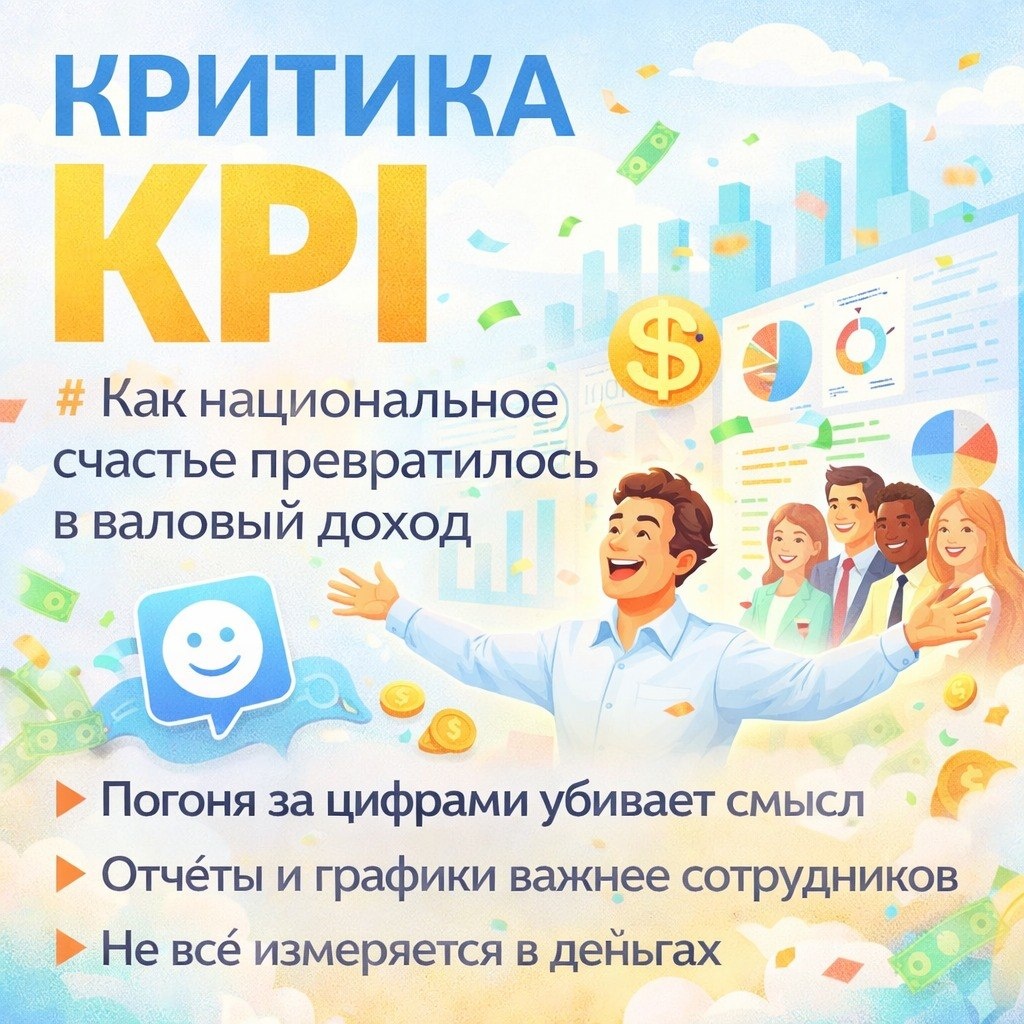 КАК НАЦИОНАЛЬНОЕ СЧАСТЬЕ ПРЕВРАТИЛОСЬ В ВАЛОВЫЙ ДОХОД: критика KPI Мы живём в мире, где всё измеряется: выручка, прибыль, KPI, конверсия, средний чек. Цифры стали главным языком бизнеса. Руководители требуют отчёты, строят дашборды и радуются, когда графики идут вверх. ❓Но вот вопрос: а где в этих цифрах остался человек? Когда-то страны измеряли успех через благосостояние людей. Через их удовлетворённость жизнью, через ощущение смысла. Сегодня почти всё свелось к валовому внутреннему продукту (ВВП). Чем больше денег крутится в экономике, тем мы якобы «успешнее». Точно так же в компаниях KPI вытеснили всё остальное. Главное выполнить план, а настроение команды, доверие клиентов и долгосрочное здоровье бизнеса отошли на второй план. 👉Это подмена ценностей. Мы начали считать деньги вместо жизни. Коротко: KPI — полезный инструмент. Но когда он становится единственным мерилом успеха, компания теряет душу. Сотрудники выгорают, клиенты чувствуют фальшь, а руководитель в итоге управляет
