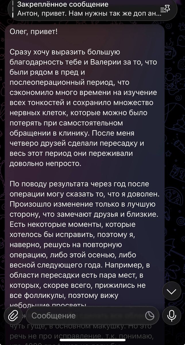 Сейчас у меня небольшой период отдыха, есть время, и, как вы видите, я делюсь фотографиями и видео из путешествия, а также даю обратную связь — в том числе на примерах переписок с клиентами. Разумеется, без раскрытия имён — конфиденциальность для меня принципиальна. Попробую сейчас записать голосовое или даже видеосообщение, где подробнее расскажу о том, что важно знать каждому, кто планирует или хотя бы задумывается о пересадке волос.