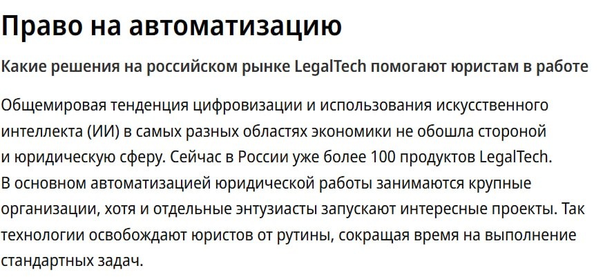 ". ГЛАВНОЕ "Коммерсант" опубликовал разбор российского LegalTech рынка. Вот ключевые тезисы: ИИ — УЖЕ ПОЛНОЦЕННЫЙ "КОПИЛОТ" ЮРИСТА Лучшие инструменты — большая тройка: → Gemini → ChatGPT → Claude Они работают. Они помогают. Они ускоряют работу в разы. С РОССИЙСКИМИ РЕШЕНИЯМИ — НЕОДНОЗНАЧНО Многие сервисы прикрутили RAG с базами КонсультантПлюс и Гарант. Это хорошо. Но есть технологический предел: Чем больше база документов, тем ниже точность поиска. Embedding-модели начинают путаться в объёме. Даже доступ к актуальной судебной практике пока не позволяет российским решениям сравняться с зарубежными аналогами. ❗️НО СИТУАЦИЯ МЕНЯЕТСЯ С 1 сентября 2027 года вступит в силу законопроект о регулировании ИИ. Для госсектора — обязательны суверенные или доверенные модели (GigaChat, YandexGPT). Иностранный ИИ может быть ограничен или запрещён. У российских разработчиков есть полтора, года чтобы догнать. Стратегия: Учитесь работать с ИИ сейчас на лучших инструментах. Готовьтесь к пе