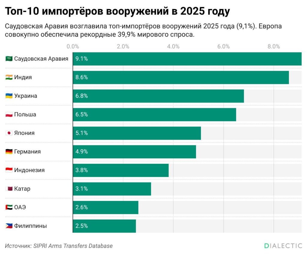 Саудовская Аравия стала крупнейшим импортёром вооружений в 2025 году. Согласно базе данных SIPRI Arms Transfers Database, она обеспечила 9,1% глобального спроса. На втором месте — Индия с долей 8,6%, на третьем — Украина (6,8%), на четвёртом — Польша (6,5%). В целом Европа в 2025 году обеспечила почти 40% мирового импорта вооружений, что стало одним из самых высоких показателей за последние десятилетия. Общий объём международных передач основных видов обычных вооружений вырос на 9,2% по сравнению с предыдущим пятилетием — это самое значительное увеличение с 2011–2015 годов. SIPRI отмечает, что данные отражают реальные поставки танков, самолётов, ракет и другой тяжёлой техники в тренд-индикаторных единицах (TIV) и не включают лёгкое стрелковое оружие или боеприпасы. База данных охватывает период с 1950 по 2025 год и считается наиболее авторитетным открытым источником по международной торговле оружием. Резкий рост европейского импорта связан с политикой стран НАТО по повышению оборонных