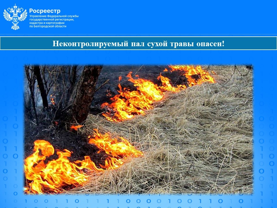 Управление Росреестра по Белгородской области предупреждает землепользователей о недопустимости пала сухой растительности. Некоторые пользователи земельных участков бесконтрольно сжигают мусор и сухую траву рядом с жилыми домами, хозяйственными постройками, чем нарушают правила пожарной и экологической безопасности. Региональный Росреестр обращает внимание белгородцев