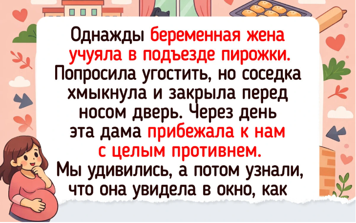 - Однажды беременная жена учуяла в подъезде пирожки. Попросила угостить, но соседка хмыкнула и закрыла перед носом дверь. Через день эта дама прибежала к нам с целым противнем. Мы удивились, а потом узнали, что она увидела в окно, как я встречаю доставку с новым холодильником. Попросила старый «по-соседки» ей подешевле перепродать.