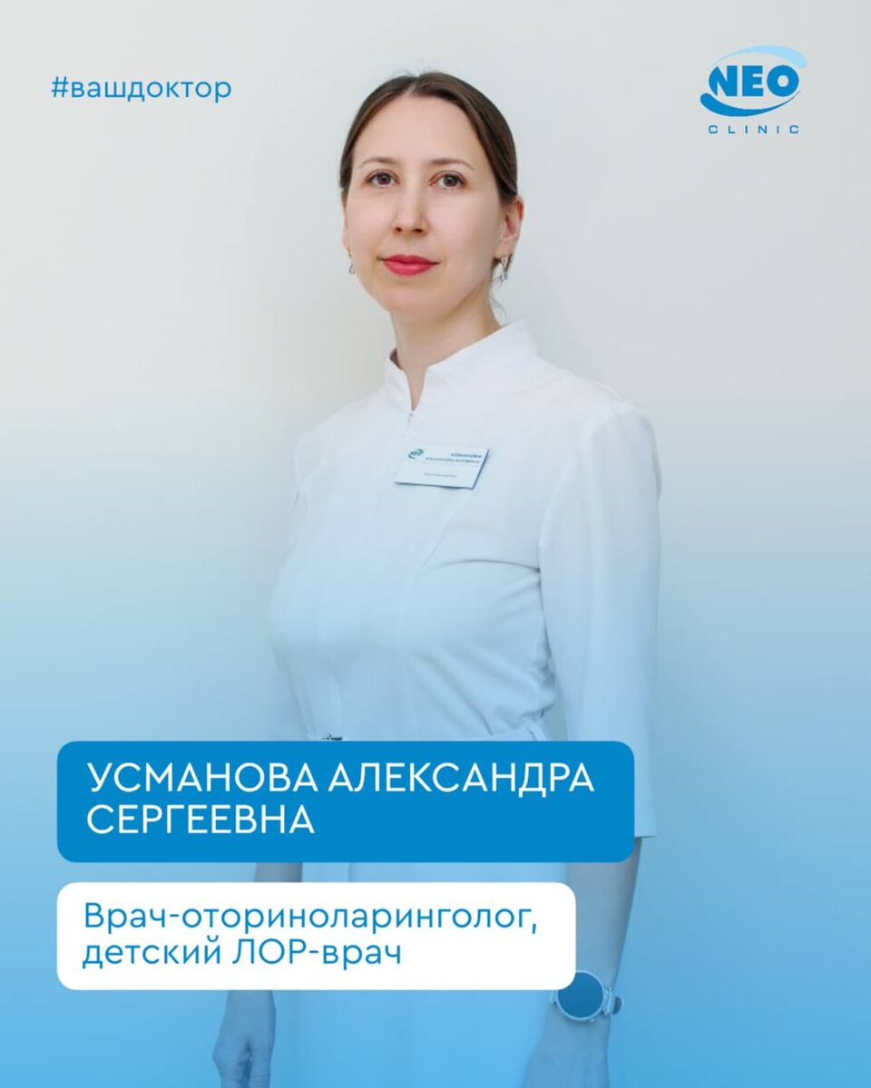 Знакомим вас со специалистом, которому доверяют здоровье и взрослых, и самых маленьких пациентов Александра Сергеевна Усманова — врач-оториноларинголог, детский ЛОР-врач с опытом работы более 17 лет 🔹 Ведёт приём взрослых и детей 🔹 Лечит заболевания уха, горла и носа 🔹 Помогает при храпе и нарушениях дыхания во сне 🔹 Подбирает современное и эффективное лечение с учётом индивидуальных особенностей Александра Сергеевна — это врач, который умеет найти подход к каждому пациенту: бережно к детям и внимательно к взрослым 💬 Когда стоит обратиться к ЛОР-врачу: ▶️частые насморки и заложенность носа ▶️боль в горле или ушах ▶️снижение слуха ▶️храп и проблемы со сном ▶️хронические ЛОР-заболевания В нашей клинике вы получите не просто консультацию, а комплексный подход к здоровью и комфортное лечение ✨ Подробнее о враче вы можете узнать на нашем сайте https://neo-clinic.com/personal/usmanova-aleksandra-sergeevna/