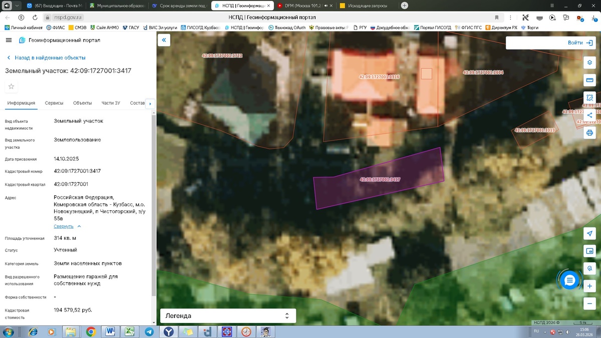 м, местоположение: Российская Федерация, Кемеровская область - Кузбасс, м.о. Новокузнецкий, п Чистогорский, з/у 55в. Земельный участок, государственная собственность на который не разграничена. Виды разрешенного использования: Размещение гаражей для собственных нужд. Категория земель: Земли населенных пунктов. Канал: Госземля Кемеровская область Область: - Район: - Населенный пункт: - Локация: Смотреть на карте ВРИ: Обслуживание жилой застройки Кадастровый номер: 42:09:1727001:3417 Кадастровая стоимость: - Вид сделки: Аренда Площадь: 314 м² Начальная цена: 13800.00 руб. Дата завершения: 24.04.2026 Подробнее: ГИС ТОРГИ #госземля #земляотгосударства #земля #земельныйучасток #земельныеторги #торги #аукцион #арендаземли #аренда #кемеровскаяобласть