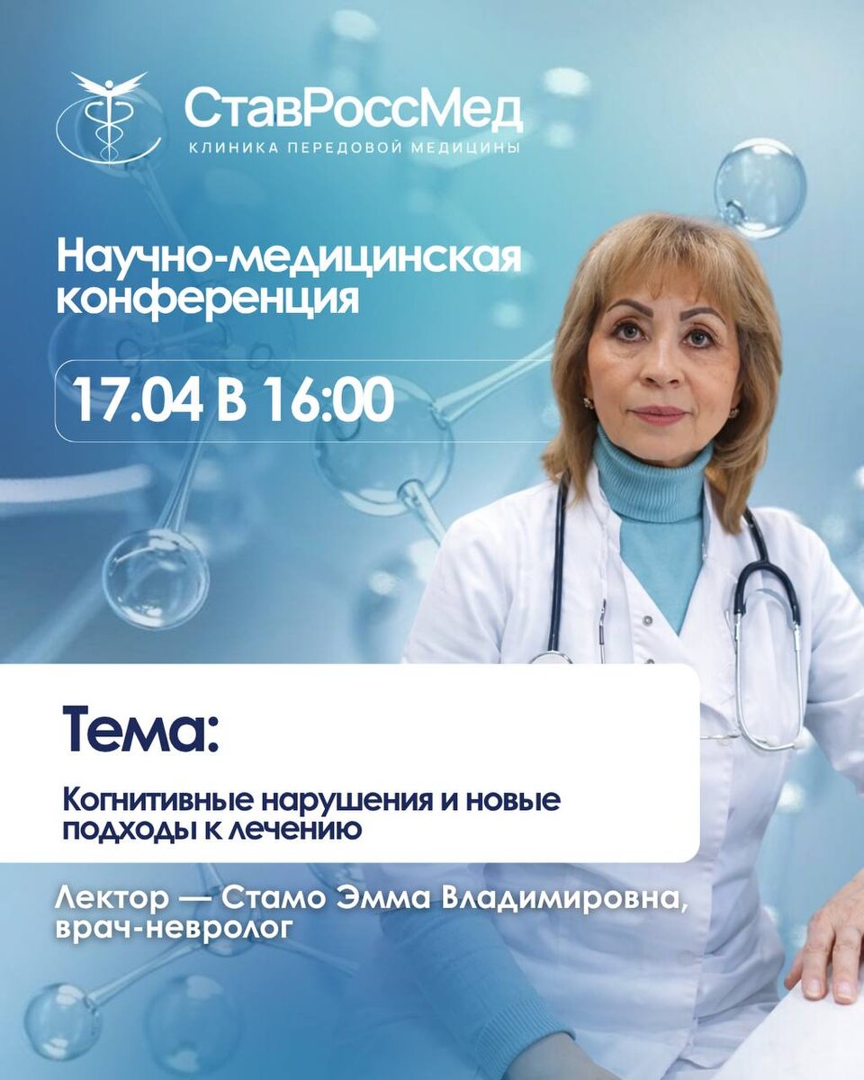 ! 🔥 17 апреля в 16:00 в клинике «СтавРоссМед» состоится научно-медицинская конференция на актуальную тему: 🧠 «Когнитивные нарушения и новые подходы к лечению» 🎤 Докладчик: Стамо Эмма Владимировна — врач-невролог 📍 Место проведения: Клиника «СтавРоссМед» Ставрополь, Российский проспект, 11 Сегодня вопросы памяти, концентрации, мышления и профилактики возрастных изменений становятся особенно важными. На конференции вы узнаете о современных научных подходах, новых возможностях диагностики и эффективных методах лечения когнитивных нарушений. 👩⚕️ Приглашаем врачей, специалистов и пациентов! Это уникальная возможность получить актуальные знания от практикующего невролога, задать вопросы эксперту и узнать о новейших решениях для сохранения здоровья мозга. ✅ Участие бесплатное ⚠️ Количество мест ограничено — обязательна предварительная регистрация по номеру 99-03-41 Не упустите шанс узнать больше о том, как сохранить ясность ума, память и качество жизни 💙