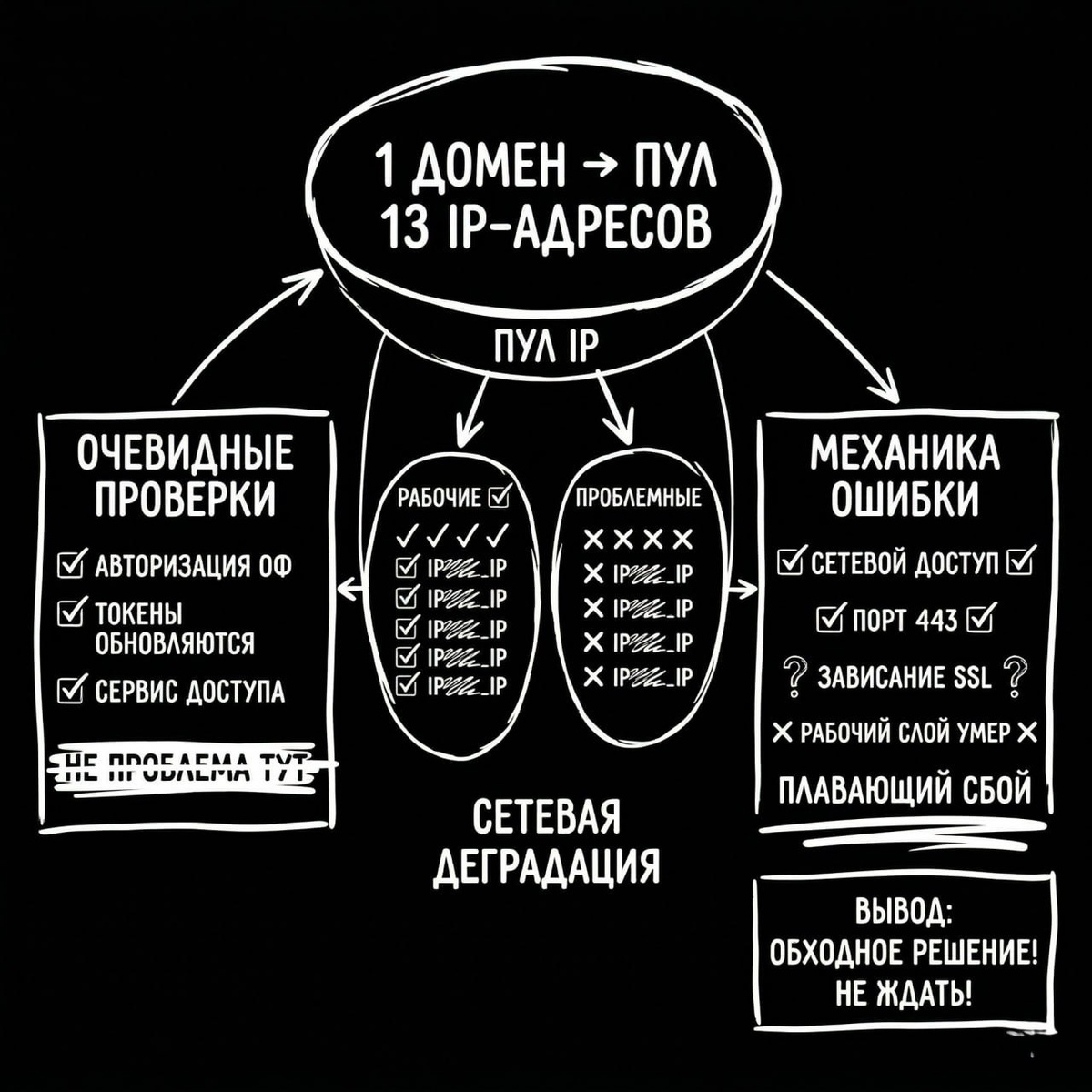 #РазборСбояBitrix24 #Битрикс24 #IT Часть №3. Ночная диагностика сбоя Битрикс24: частичная деградация IP-адресов пула Вечером пятницы мы начали разбирать проблему не на уровне ощущений, а на уровне конкретных технических слоёв. Сначала проверили самое очевидное: Авторизация жива. Обновление токенов работает. Служба выдачи доступа отвечает нормально. Значит, проблема не в токенах, не в базе и не в том, что приложение «разавторизовалось». Потом пошли глубже. Ключевое открытие Пул из 13 IP-адресов Мы начали смотреть, как именно идут запросы до облачных порталов Битрикс24, и обнаружили вещь, с которой раньше не сталкивались. Один и тот же домен вёл на пул из 13 IP-адресов. При этом часть адресов работала штатно, а часть стабильно ломалась. Это был самый важный поворот всей истории. На проблемных адресах была доступность по сетевому протоколу. Проходило соединение на 443 порт. Но дальше соединение зависало на уровне установки защищённой связи. То есть снаружи всё выглядело так, будто