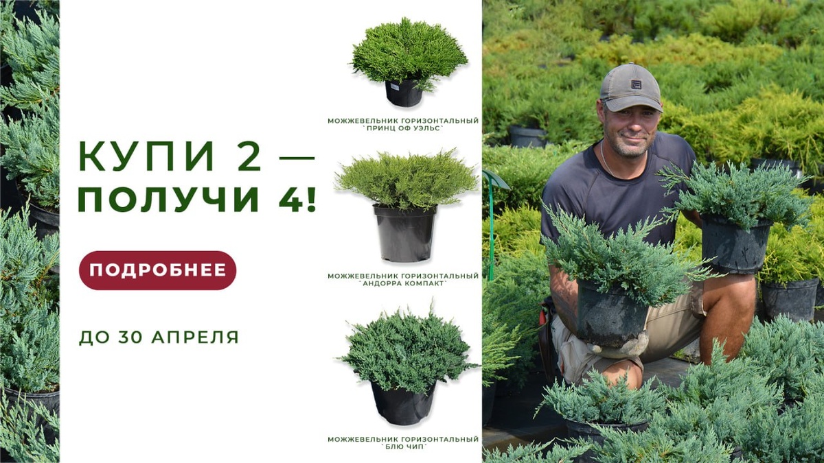 ! Сначала — главный хит: 4 можжевельника по цене 2 🔥 Горизонтальные сорта в контейнерах С5 (5 л): «Принц оф Уэльс», «Андорра Компакт», «Блю Чип» ➡️ Миксуйте любые ➡️ Каждая четвёрка: платите только за 2 ➡️ Цена 1 шт — 1590 ₽ 💰 Экономия с четвёрки = 3180 ₽ А теперь — 20% на шаровидные туи 🎾 • «Тайни Тим» С5: было 1590 → 1272 ₽ • «Вудварди» С10: было 3900 → 3120 ₽ • «Даника» С20: было 6900 → 5520 ₽ 📌 Скидка не суммируются с другими. Только указанные сорта и объёмы. 📍 с. Подстёпки, ул. Фермерская, 14а ⏰ Ежедневно с 9:00 до 17:00 Успейте до 30 апреля 💚