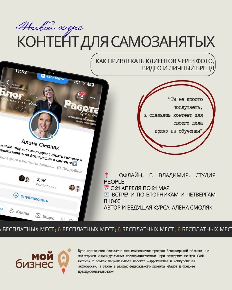 »: «Контент для самозанятых: как привлекать клиентов через фото, видео и личный бренд» Это не про “красиво вести блог” Это про то, как через контент: — вызывать доверие — показывать свою ценность — и привлекать клиентов в своё дело Что будет на курсе: — разберём твоё позиционирование и личный бренд — упакуем страницу, чтобы она вызывала доверие — дадим систему контента: что, как и зачем снимать — научу снимать фото и видео на телефон — покажу простой монтаж и работу с ИИ — отработаем сторис, рилс и говорящую голову — создадим контент именно под твою нишу 👉 и главное — ты не просто послушаешь, а сделаешь контент для своего дела прямо на обучении. Формат: 📍 Офлайн, г. Владимир, студия People 📅 С 21 апреля по 21 мая 🕙 Встречи по вторникам и четвергам в 10:00 💥 ВАЖНО (прочитай внимательно) Курс проводится бесплатно для самозанятых граждан Владимирской области, не являющихся индивидуальными предпринимателями, при поддержке центра «Мой бизнес» в рамках национального проекта «Эффект