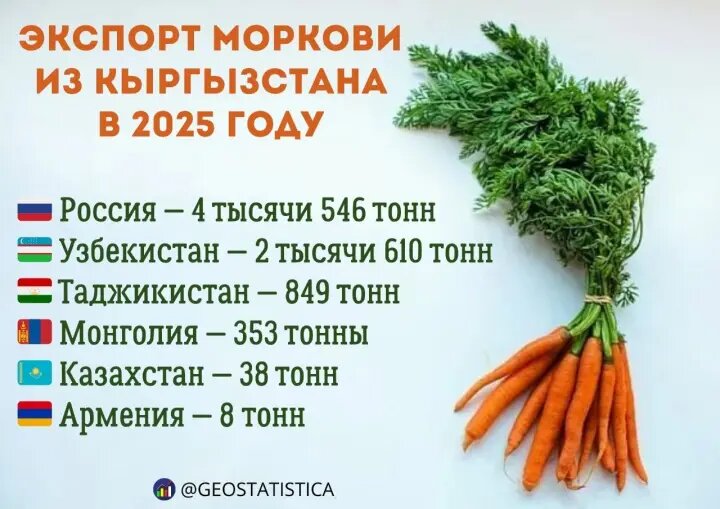 Telegram-канал "Геостатистика" сообщил, что в 2025 году Кыргызстан продолжил наращивать экспорт овощной продукции, а заметное место в его структуре заняли поставки моркови на внешние рынки.