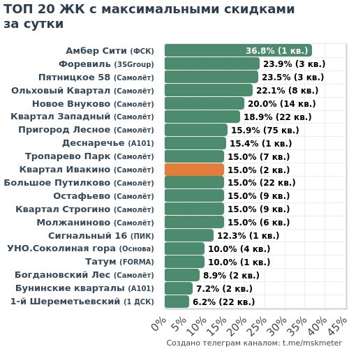🟩 Честные скидки: 26 ЖК (552 кв.) 🟧 Маркетинг скидки: 14 ЖК (160 кв.) 💎 МАКСИМАЛЬНАЯ ЭКОНОМИЯ 🏆 ФСК • Амбер Сити └🔻27.2M → 73.9M • 4-к 95м² 🥈 3SGroup • Форевиль ├🔻5.4M → 22.4M • 3-к 68м² ├🔻4.9M → 23.4M • 3-к 68м² └🔻4.7M → 24.1M • 3-к 68м² 🥉 Самолёт • Новое Внуково ├🔻3.9M → 19.4M • 3-к 79м² ├🔻3.8M → 19.1M • 3-к 77м² └🔻3.2M → 21.2M • 3-к 79м² 4️⃣ Самолёт • Пятницкое 58 └🔻2.7M → 11.6M • 1-к 46м² 5️⃣ Самолёт • Квартал Строгино └🔻2.7M → 17.8M • 1-к 42м² 🔑 САМЫЕ ДОСТУПНЫЕ 🏆 Самолёт • Богдановский Лес ├🔻48к → 4.8M • Студия 22м² └🔻503к → 5.6M • 1-к 32м² 🥈 1 ДСК • 1-й Химкинский ├🔻50к → 4.8M • Студия 21м²❗️ ├🔻51к → 4.9M • Студия 21м²❗️ └🔻51к → 4.9M • Студия 21м²❗️ 🥉 Самолёт • Пригород Лесное ├🔻766к → 5.1M • Студия 23м² ├🔻810к → 5.1M • Студия 23м² └🔻812к → 5.1M • Студия 23м² 4️⃣ Самолёт • Новое Внуково └🔻984к → 6.6M • Студия 24м² ❗️— лоту меньше месяца 👇 Полная статистика: 📲 В Telegram | 🌐 На MskMeter.ru