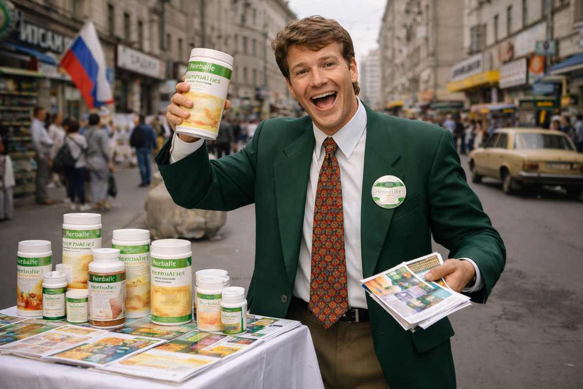 Банки, значки и почти религиозная вера в «новую жизнь» В 90-е слово «Гербалайф» знали даже те, кто никогда его не покупал. Для одних это был символ модного западного образа жизни, для других — почти ругательство и синоним навязчивых продавцов. Баночки с порошками, рассказы про очищение организма, похудение, энергию и невероятное оздоровление тогда мелькали буквально везде. Казалось, что это не просто продукт, а целая философия новой жизни, которая пришла из Америки. Популярность Гербалайфа во многом объяснялась самой атмосферой 90-х. Люди внезапно оказались в мире, где старые советские ориентиры исчезли, а новые только формировались. Всё западное казалось более современным, эффективным и почти волшебным. Если на упаковке было иностранное название, а продавец уверенно говорил про здоровье, витамины и контроль веса, это уже звучало убедительно. Секрет был не только в самих банках и коктейлях. Гербалайф продавал мечту. Причём сразу несколько мечт: быстро похудеть, стать бодрее, выглядеть
