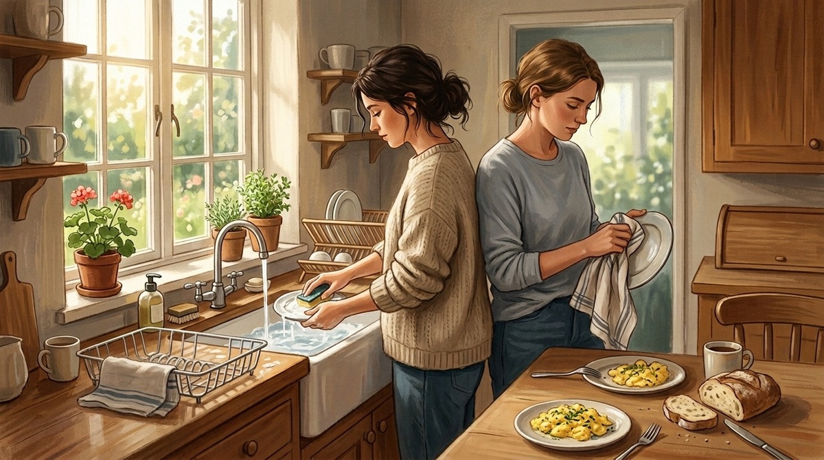 Свекровь, проходя по коридору, замедлила шаг. Увидела их у раковины. Молча стоящих рядом. Она ничего не сказала. Просто пошла дальше, а уголки её губ дрогнули в едва заметной улыбке.