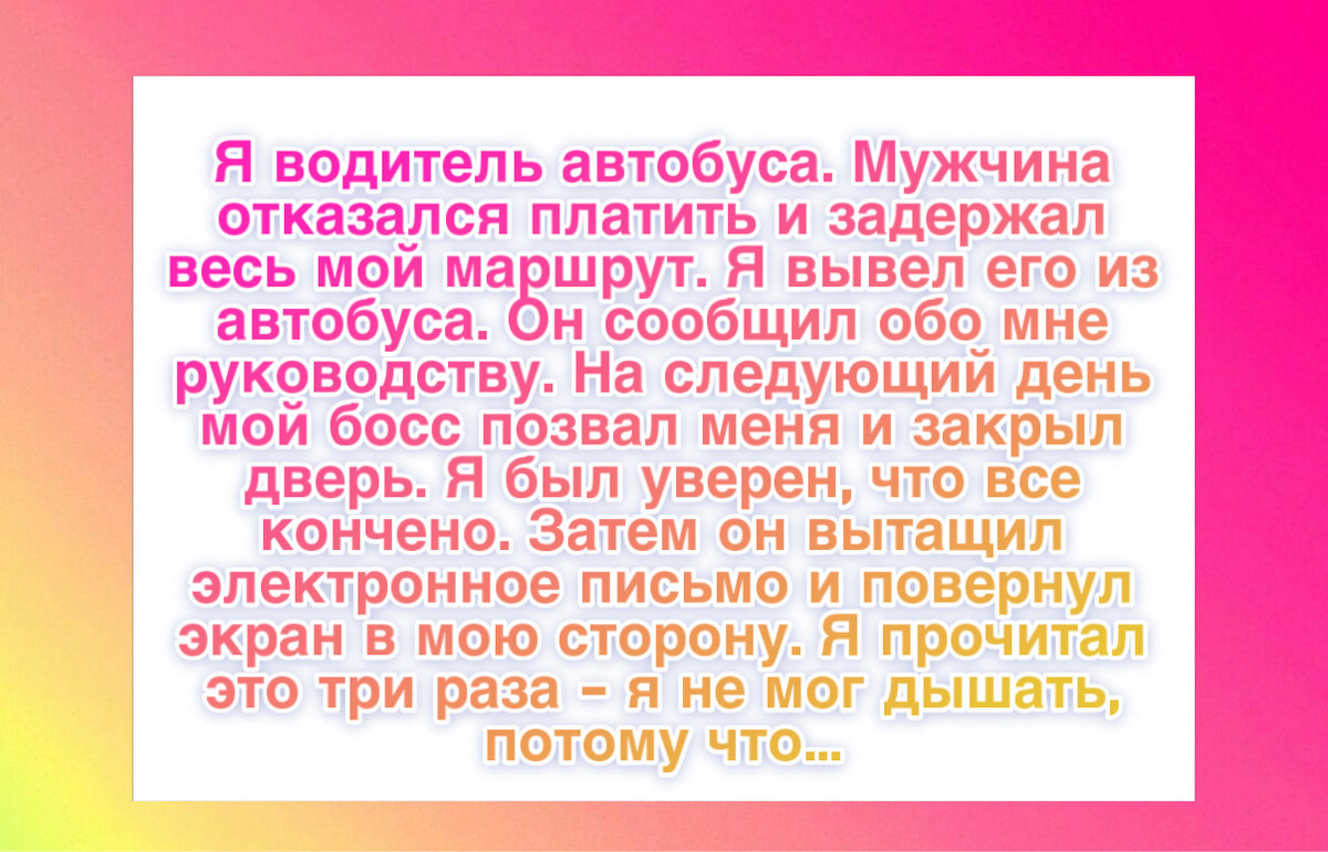 “Я работал водителем автобуса и однажды столкнулся с агрессивным пассажиром, который подал на меня жалобу. Начальник вызвал меня к себе и показал записи с камер, доказывающие мою невиновность. Он пообещал поддержать меня и даже предложил сопровождать в полицию. В тот момент я понял, что не один.”