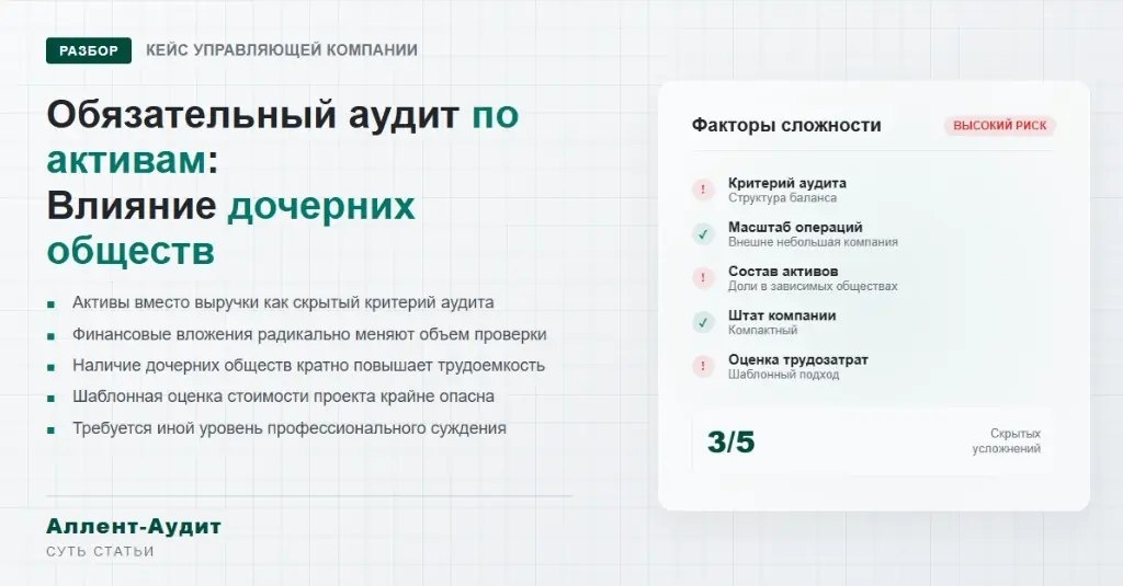 В новом материале разобрали кейс управляющей компании с дочерними обществами, где обязательный аудит возник по активам, а ключевая сложность скрывалась в структуре финансовых вложений и объеме проверочных процедур. В статье: — почему компания на первый взгляд казалась простой для аудита; — почему основание для обязательного аудита возникло именно по активам; — что скрывалось за строкой финансовых вложений в балансе; — как дочерние общества влияют на трудоемкость проверки; — почему выручка и штат не показывают реальный объем работ; — как на практике формируется объем обязательного аудита; — почему шаблонно низкая цена в таких кейсах может быть ошибкой; — что важно заранее учесть управляющей компании. Читать статью: https://www.allent-audit.ru/blog/obyazatelnyy-audit-po-aktivam-case/
