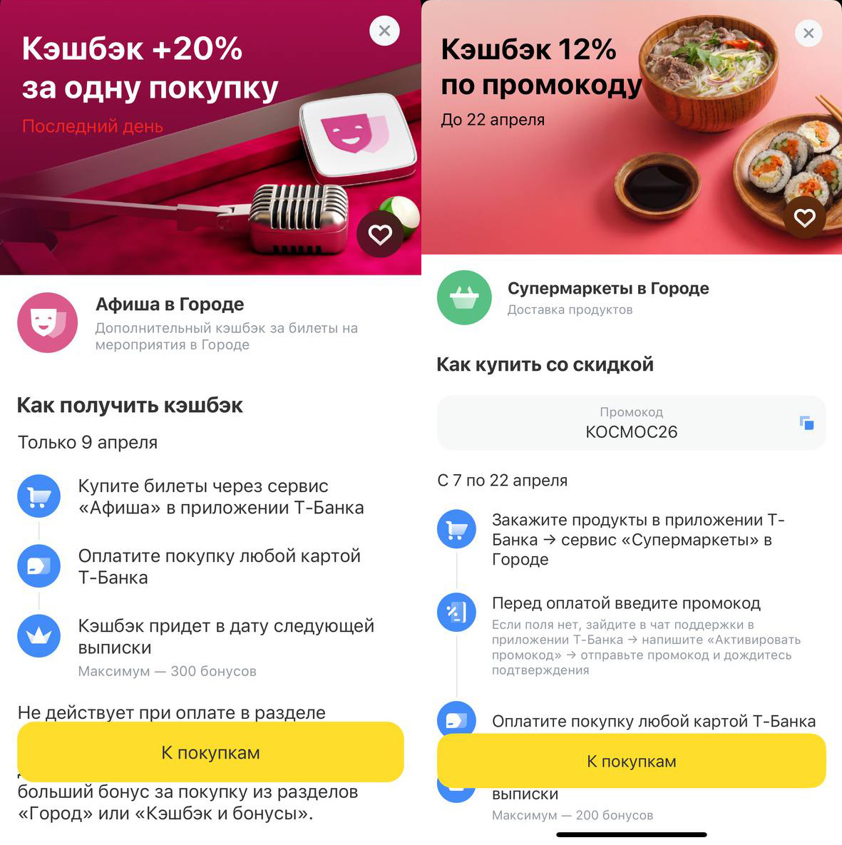 Привет, мои охотники за выгодой! Сегодня мой любимчик Т-Банк снова решил порадовать мою внутреннюю жабу. Упал доп. кэшбэк на «Афишу» в Городе +20% (а везунчикам прилетает и +25%!). Я не смогла молчать и решила запилить отдельный гайд. Разбираемся, как суммировать всё, что плохо лежит, и превращать обычные покупки в праздник экономии. В Т-Банке есть категории месяца. Если вы их правильно выбрали, начинается магия суммирования. У меня расклад такой: Важно: Проверяйте свои приложения! У кого-то на супермаркеты в этом месяце упало 17%, а у кого-то на топливо (редкий зверь, но меткий). Помимо кэшбэка, у Т-Банка есть промокоды. Они так же прекрасно суммируются с категорией месяца и с предложением дня, и мы из наших 42% легким движением руки делаем кешбек в 62% к примеру. Они обычно «непубличные» и прячутся по углам, но я перерыла весь интернет и собрала для вас рабочий список. Закупаемся продуктами и возвращаем кешбек: На первую заправку можно получить дополнительно +7% (при чеке от 1000