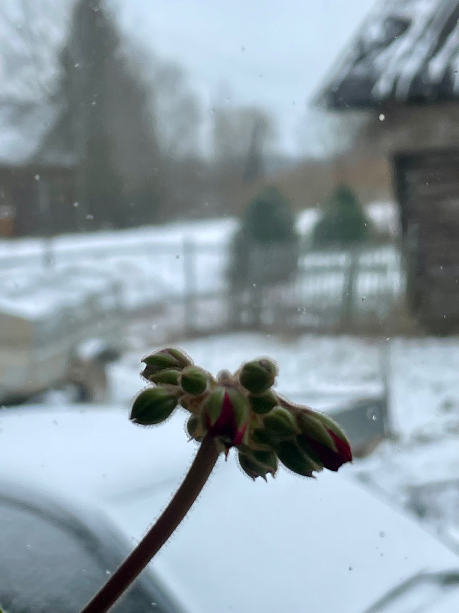 Белым бело, а очередная геранька в тепле и ей очень хочется зацвести.