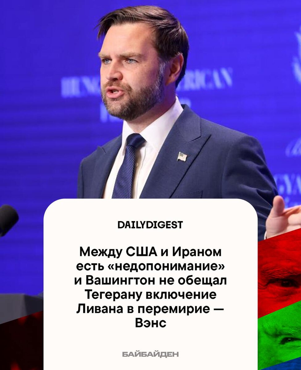 : 🔹Между США и Ираном есть «недопонимание», и Вашингтон не обещал Тегерану включение Ливана в перемирие — Вэнс. 🔹Иран предписал судам, проходящим через Ормузский пролив, двигаться по двум альтернативным маршрутам, чтобы избежать столкновений с минами — ВМС КСИР. 🔹Администрация Трампа планирует наказать страны НАТО, не поддержавшие США и Израиль в войне с Ираном. 🔹В результате израильской атаки на Ливан погибли не менее 254 человек, ранены 1165 — Al Jazeera. 🔹США нарушили три пункта предложения Ирана: прекращение огня в Ливане, запрет на вторжение в воздушное пространство страны и сохранение права на обогащение урана. 🔹Генсек НАТО Марк Рютте признал, что Трамп разочарован союзниками по альянсу. 👍«БайБайден» в МАХ