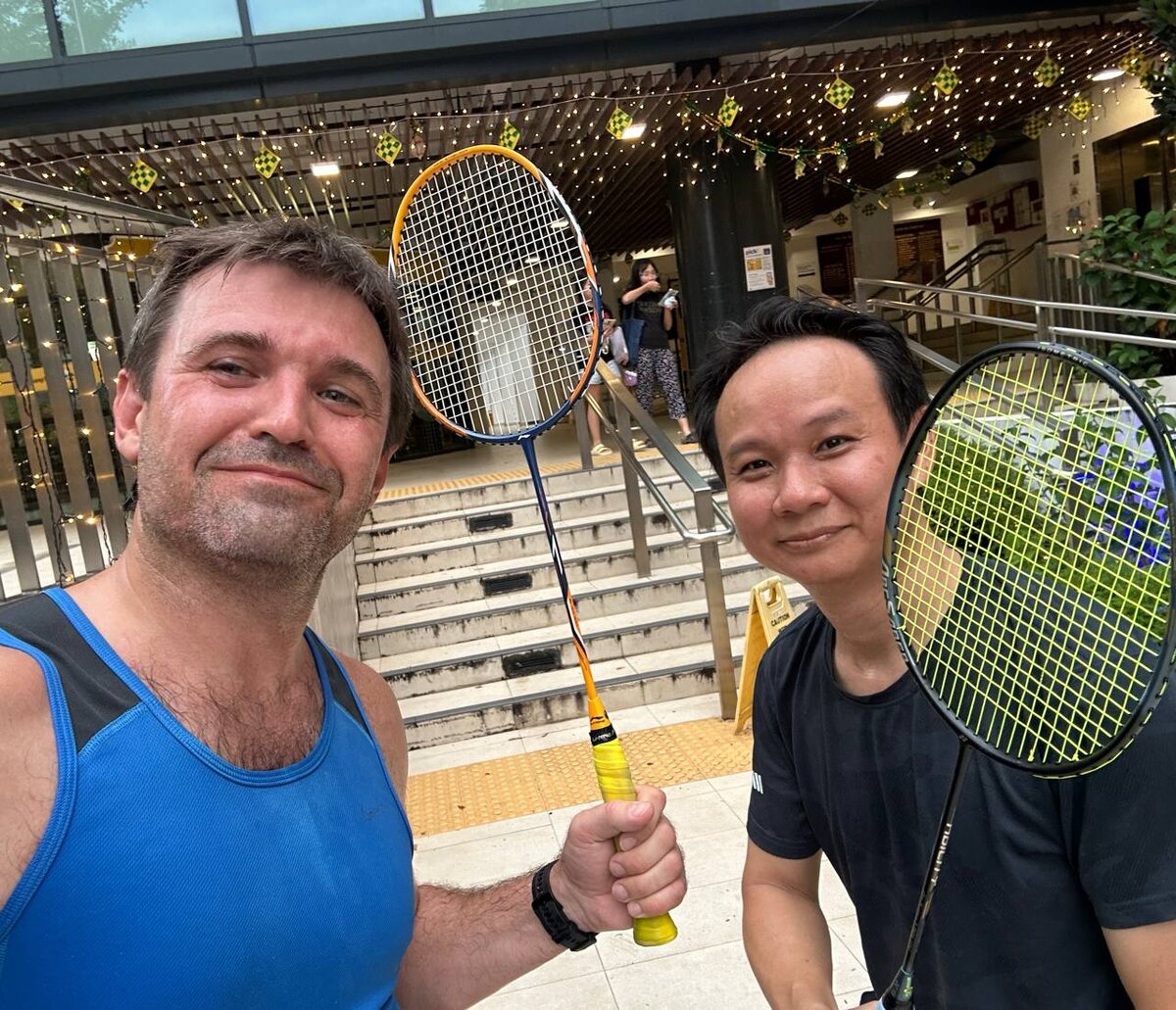 ! Я первый раз смог выиграть хотя бы один раунд в Бадминтон у своего Сингапурского товарища! Но скажу я вам играть в Сингапуре это жесть: 1. Почти все корты без кондиционера 2. Многие корты как и тот где мы играли, еще и в таком полуоткрытом помещении с открытыми проемами в стенах на улицу ( чтобы воздух немного ходил , но ветра не было). Так вот в таких местах еще жарче чем на улице! 3. Безусловно на улице в 100 км от экватора жара 35, влажность 80% 4. Дышать сложно, как будто в воздухе кислорода не хватает! Короче, играешь, а мир вокруг кружиться. Местные походу привыкли. А я устаю больше чем от полумарафона. Час игры и я еле дышу и пошатываюсь.