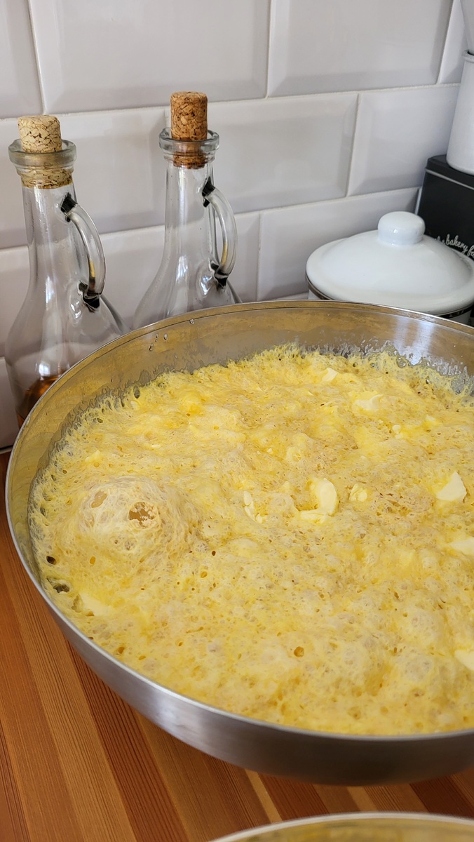 Опара для кулича готова! Начинаю замешивать тесто. Опару перелила в 10 литровое ведро, добавила соль, ванилин, изюм и муку. Всё перемешала руками до однородной массы. НЕ НУЖНО долго вымешивать! Как только тесто стало однородной консистенции, накрываю полотенцем и