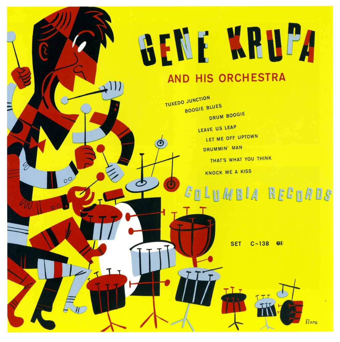 Именно таким – гримасничающим, мультяшно жующим жвачку «многочленом» с несколькими парами рук и ног, запечатлел его Джим Флора на обложке альбома 1947 года Gene Krupa and His Orchestra. Это тот самый яркий и самобытный стиль раннего Флоры, с открытыми цветами и прыгающей типографикой, точно передающий энергетику и импровизацию свинга и бибопа, родственные самому художнику. Кажется, что обложка начинает звучать в ритме свинга еще до того, как ты водрузишь диск на вертушку. Посмотрите сами, как говорится, имеющий глаза да услышит.