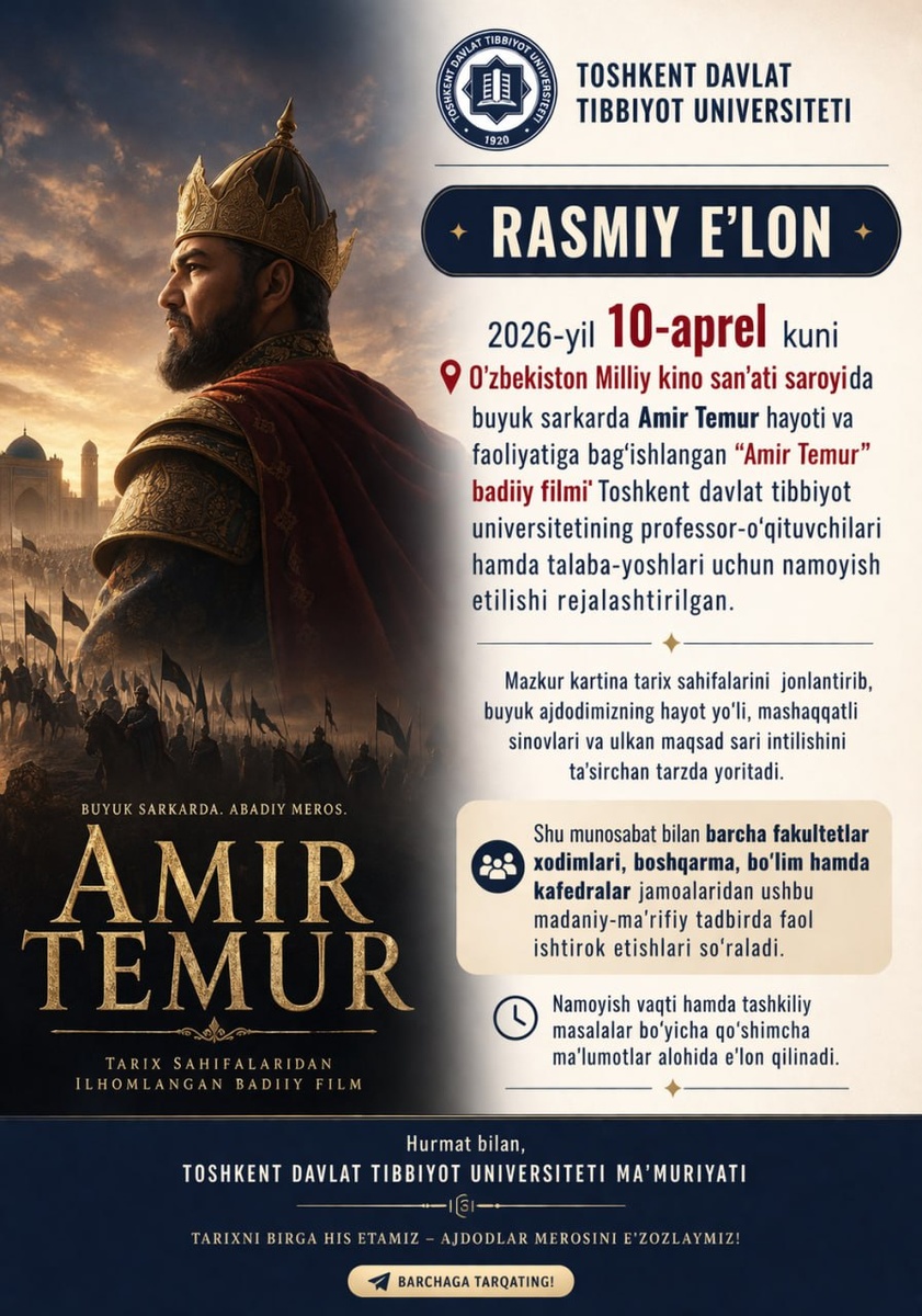 Hurmatli Toshkent davlat tibbiyot universiteti professor-o‘qituvchilari, talaba-yoshlari va universitet xodimlari! Sizlarni “Amir Temur” filmi taqdimotiga taklif etamiz. 🗓 Sana: 2026-yil 10-aprel 🕒 Ro‘yxatga olish soat 14:00 dan boshlanadi 📍 Manzil: O‘zbekiston Milliy kino san’ati saroyi Film taqdimoti tarixiy merosimizni yanada chuqurroq anglash, yosh avlodni Vatanimizning buyuk ajdodlari bilan tanishtirish va tarixiy bilimlarni boyitish maqsadida tashkil etilmoqda. Hurmat bilan, Toshkent davlat tibbiyot universiteti ma’muriyati 📞 Murojaat uchun: +998 99 8462608