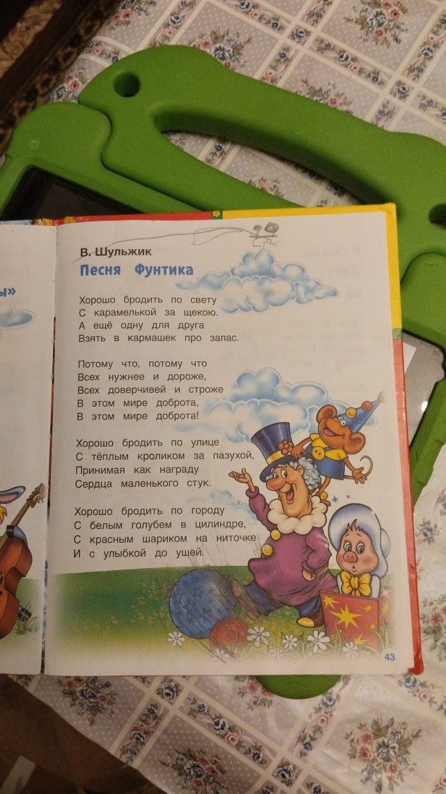 Наш Рост очень любит песни в любом варианте: в мультиках, чтобы пели родители, чтобы пела Алиса. Сегодня он тоже решил, что ему хочется кое-что послушать. И он нашел способ об этом сказать: нашел книгу с песнями и показал, чтобы ему хотелось: это была "Песня Фунтика". Но вот беда, мы были заняты, к тому же у Ростика есть особенность: слушать песню много-много раз. Спев песню один раз и поняв, что я не готова на большее, я сделала Ростику новую кнопку на коммуникаторе, чтобы он мог сам решить свою проблему и попросить, что он хочет, столько раз, сколько ему надо.