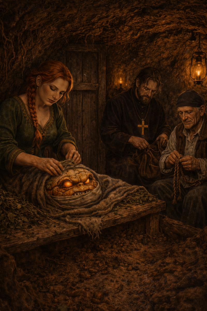 Иоанн стоял у стены, слишком высокий для этой норы, и потому сутулился еще сильнее обычного. Акакий ходил из угла в угол, цепляясь локтями за полки и ругаясь каждый раз, когда что-нибудь падало. Колобок лежал у печки, завернутый в тряпку, как младенец, которого очень любили. Он явно шел на поправку. Уже не кашлял огнем, не стонал каждые пять минут и даже снова начал скалиться. Но по привычке продолжал изображать из себя великого мученика, героически раненного в бою.