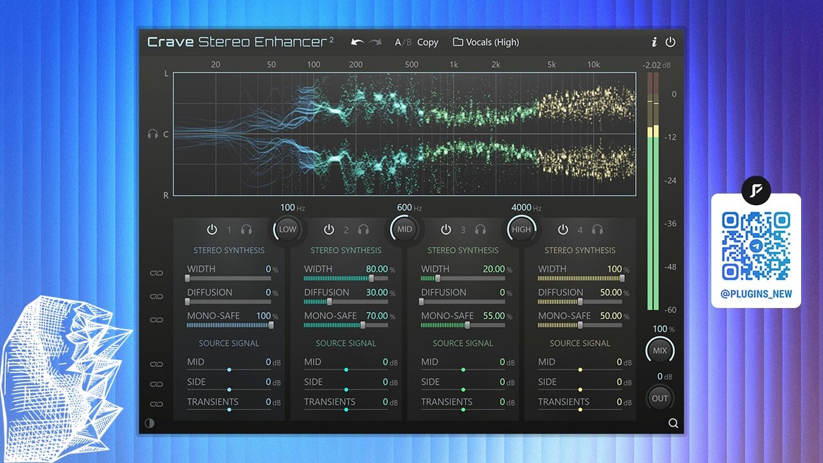 Скачать - тык Установка:💜 1. Установите плагин 2. Установите R2R System 3. Активируйте при помощи WM_CraveDSP.r2rwm Примечание: Если возникла ошибка "Signature verification failed", то перезагрузите ПК, либо переместите файл .r2rwm на другой диск и запустите. Подробнее: 😊 Crave Stereo Enhancer — это четырехполосный стереофонический процессор, который точно управляет звуком, обеспечивая прозрачное звучание и гибкость в работе с моно- и стереосигналами. Точное расширение стерео В основе модели лежит параметрический стереосинтез с двумя независимыми параметрами. Они позволяют точно контролировать стереофонический контент и избежать артефактов, часто встречающихся у традиционных расширителей. • Ширина — регулирует объем синтезируемой боковой информации для каждого диапазона. • Диффузия — определяет плотность и характер стереофонической информации. Комбинируя эти параметры, можно создать широкое и естественное стереозвучание, подходящее для любого материала. Целостность переходных