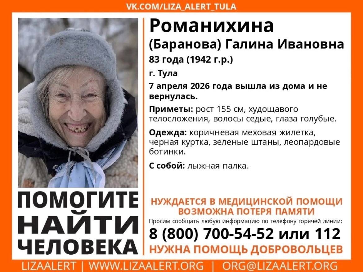 7 апреля 83-летняя Романихина (Баранова) Галина Ивановна вышла из дома и до настоящего времени не вернулась. Ее местонахождение остается неизвестным. Приметы: рост около 155 см, худощавое телосложение, седые волосы, голубые глаза. Одета: коричневая меховая жилетка, черная куртка, зеленые штаны, ботинки с леопардовым принтом. При себе имела лыжную палку. Всех, кто обладает какой-либо информацией о местонахождении пропавшей, просят незамедлительно сообщить по телефону: 8 (800) 700-54-52