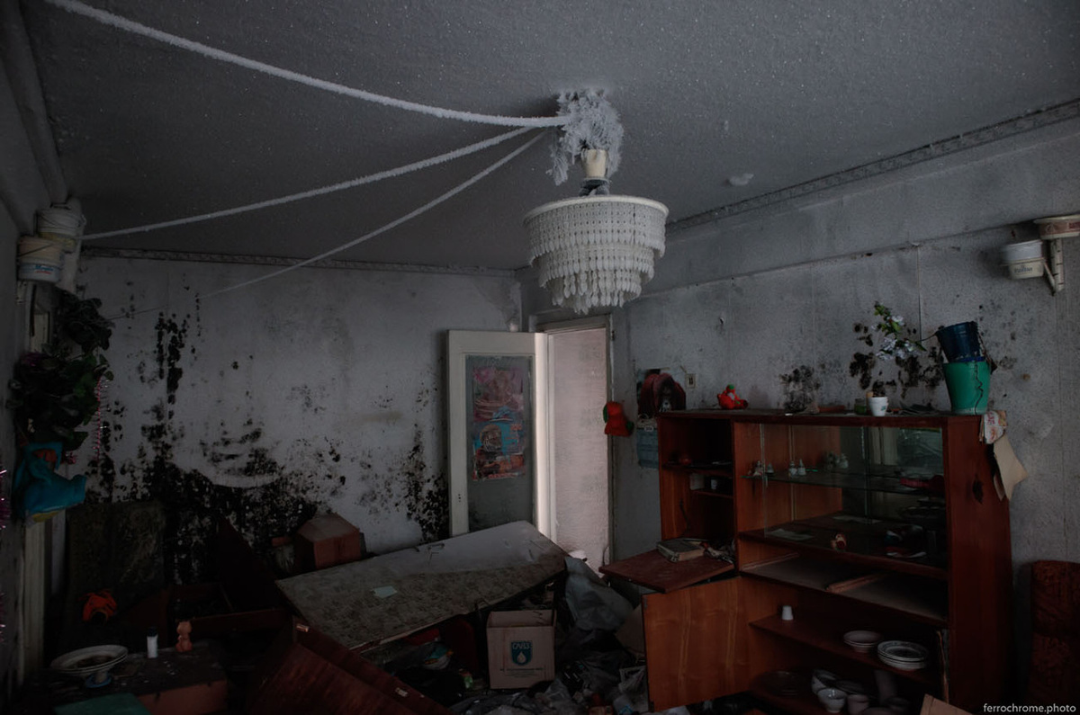 В квартирах люди оставили многое. Здесь и шкафы, наполненные одеждой, и телевизоры, торшеры и диваны. Замороженные кухни заставлены посудой. А потолки и люстры обросли снежной бахромой. Особенно удивили