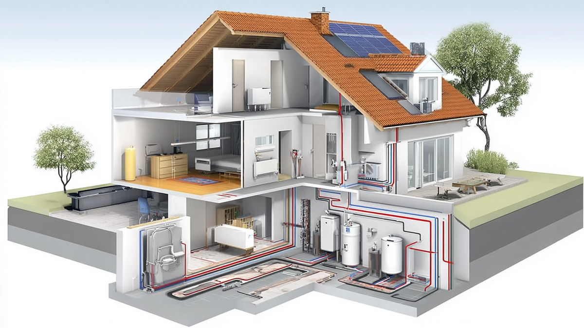 Водяное (газ/дрова/электричество — самое популярное), воздушное (быстрый прогрев, но дорогой монтаж), электрическое (просто, но дорого в эксплуатации). Схемы разводки: однотрубная (экономно, но неравномерный прогрев), двухтрубная (оптимально для больших домов), лучевая/коллекторная (идеально для дизайна — трубы скрываются, зонирование температуры).