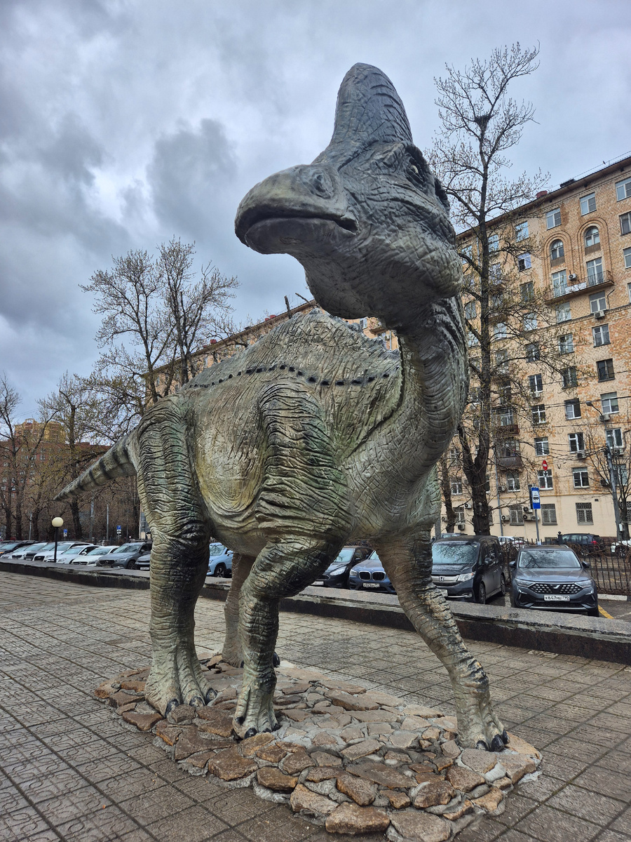 Перед входом стоит большой макет динозавра. Гриша с ним немного попозировал, то есть покривлялся :)