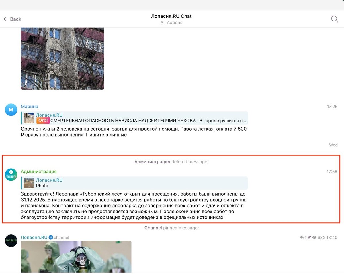 … У руководства лесопарка “Губернский лес” выдалась непростая ночь. Оно пыталось уличить “Лопасню” в детсадовском вранье, однако вызвало эффект Стрейзанд и получило от жителей Чехова полную шапку “добрых слов” (спасибо нашей аудитории за позицию, кстати!). Дело было так. 🍿 Вчера нами был опубликован пост с фотографиями жителей округа о том, в каком ужасном состоянии находится территория лесопарка “Губернский лес”, который обещали открыть в апреле, но так и не открыли. В комментарии под этим постом немедленно явилась “Администрация” с заявлением следующего содержания: “Здравствуйте! Лесопарк «Губернский лес» открыт для посещения, работы были выполнены до 31.12.2025. В настоящее время в лесопарке ведутся работы по благоустройству входной группы и павильона. Контракт на содержание лесопарка до завершения всех работ и сдачи объекта в эксплуатацию заключить не предоставляется возможным. После окончания всех работ по благоустройству территории информация будет доведена в официальных исто