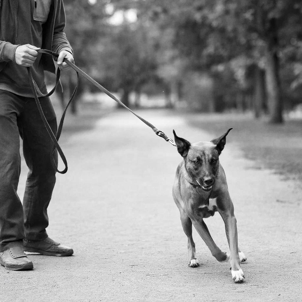 1. Рывки и наказания — собака не понимает, почему её дёргают, но связывает боль с вами или с местом, куда она стремится. В итоге страх усиливает напряжение.