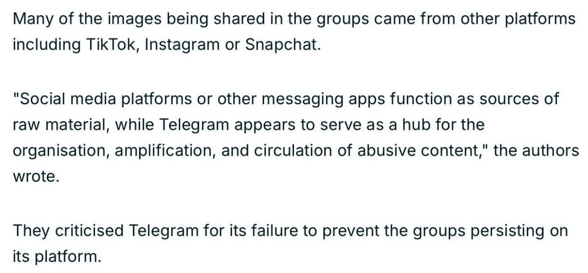 : 🇪🇺 ЕС пытается оправдать своё стремление к усилению слежки (Chat Control) и цензуры (DSA) через контролируемые НПО и СМИ. AI Forensics, подрядчик Европейской комиссии, финансируемый Соросом, заявляет, что Telegram — это ПРОБЛЕМА, потому что люди могут обсуждать контент из ДРУГИХ социальных сетей в ПРИВАТНЫХ группах Telegram (см. скриншот от государственного France24 ниже). 📣 Безумный нарратив этой «негосударственной» организации распространяется глобалистскими изданиями (El País, Der Spiegel, Wired) и AFP (французский «ИТАР-ТАСС»), который копируется «свободной» французской прессой (Le Parisien, 20 Minutes, Ouest-France, Le Figaro). Сомневаюсь, что кто-то ещё серьёзно воспринимает эти организации 🤡 — большинство из них потеряли доверие людей во время эпохи COVID. Но важно разоблачать все такие попытки общественной манипуляции, потому что они используются, чтобы отнять то, что осталось от наших свобод. 🗽 Телеграм заменяет людям некогда авторитетные СМИ. Не удивительно, что СМ
