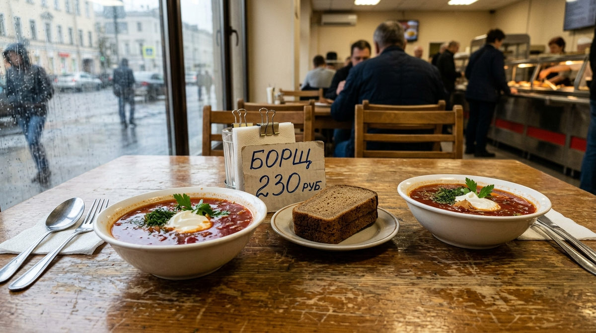 Борщ — 250 ₽ за порцию. Котлета с гарниром — 290 ₽. Чай — 70 ₽. Хлеб — 30 ₽. Всё стандартно. Никаких сюрпризов. Еда — нормальная. Не хорошая и не плохая. Просто еда. Для 12 миллионов человек это привычный обед. Они не задумываются о цене, потому что сравнивать не с чем.