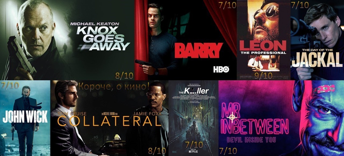 Вне рейтинга Джон Уик/John Wick 2014-... Моя оценка: 7 из 10 Средняя оценка всех фильмов серии на КП/IMDb: 7,2/7,5 Джон Уик, на первый взгляд, ничем не примечательный тихий и спокойный человек, но в недалёком прошлом он один из лучших наёмных убийц в мире. И однажды к нему вламываются, убивают пса и угоняют машину. Из-за чего ему приходится вернуться в мир из которого он с трудом вырвался. Рейтинг 1. Леон/Leon 1994 Моя оценка: 9 из 10 Оценка на КП/IMDb: 8,7/8,5 Одинокий киллер неожиданно берёт под защиту девочку и постепенно выходит за рамки своей холодной профессии, сталкиваясь с эмоциями, которые не вписываются в его мир. 2. Соучастник/Collateral 2004 Моя оценка: 8 из 10 Оценка на КП/IMDb: 7,9/7,5 Обычный таксист оказывается втянут в ночную работу наёмного убийцы, где каждая остановка — часть чётко выстроенного плана, а любая ошибка может стоить жизни. 3. Хитмен. Последнее дело/Knox Goes Away 2023 Моя оценка: 8 из 10 Оценка на КП/IMDb: 7,7/7,0 Профессиональный киллер сталкиваетс