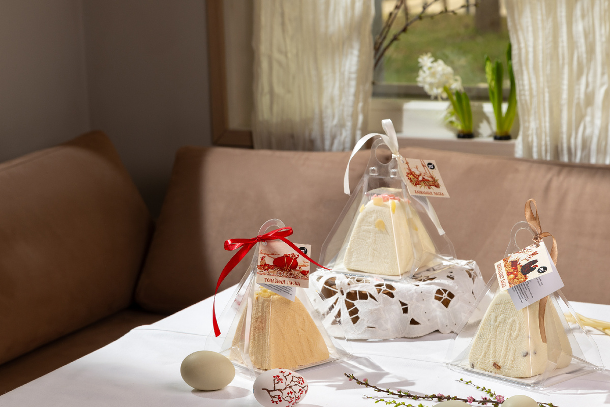 Мы приготовили творожную пасху трёх видов: из топлёного творога, с ванилью и шоколадными каплями. Из органического творога, без консервантов, усилителей вкуса и других лишних добавок. Творог, сливочное масло, сахар, ваниль или шоколад тщательно вымешиваем, затем выкладываем в форму, выстланную двойным слоем марли. Под прессом и при температуре 4°С пасха ночует 12 часов, чтобы ушла лишняя влага. На следующее утро украшаем шоколадной стружкой или миндальными лепестками.