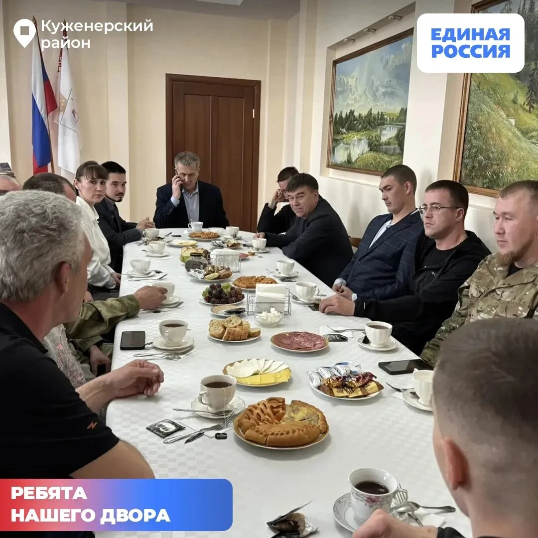 В администрации Куженерского района в рамках реализации проекта Марийского регионального отделения партии «Единая Россия» «Ребята нашего двора» состоялась встреча «Разговор по душам» с бойцами, вернувшимися из зоны специальной военной операции. Участниками встречи стали: