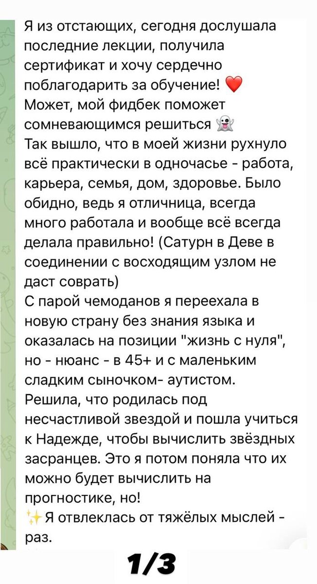 Казалось бы, какая астрология, когда жизнь в огне? Но вот в чем дело. Когда в жизни всё более-менее спокойно, астрология многим кажется чем-то дополнительным. Интересным, полезным, но не жизненно необходимым. Она становится по-настоящему нужна, когда все рушится. Когда подводит здоровье, не хватает денег, каждая ошибка откидывает назад. Когда оглядываешься и думаешь: если бы я тогда сделала так, все сложилось бы иначе, вложилась бы , рассталась бы, уволилась и тд Ученица пришла именно в такой момент. Не когда «все наладилось», а когда было тяжелее всего. Пришла «вычислить звездных засранцев». А получила другое. Из «я родилась под несчастливой звездой» пришла к ощущению «мне везет».