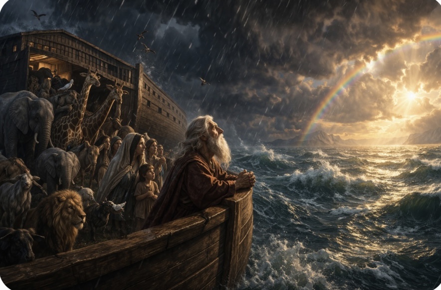 Ной воздвиг жертвенник и принёс благодарение. И тогда на небе появилась радуга — светлая, как обещание.