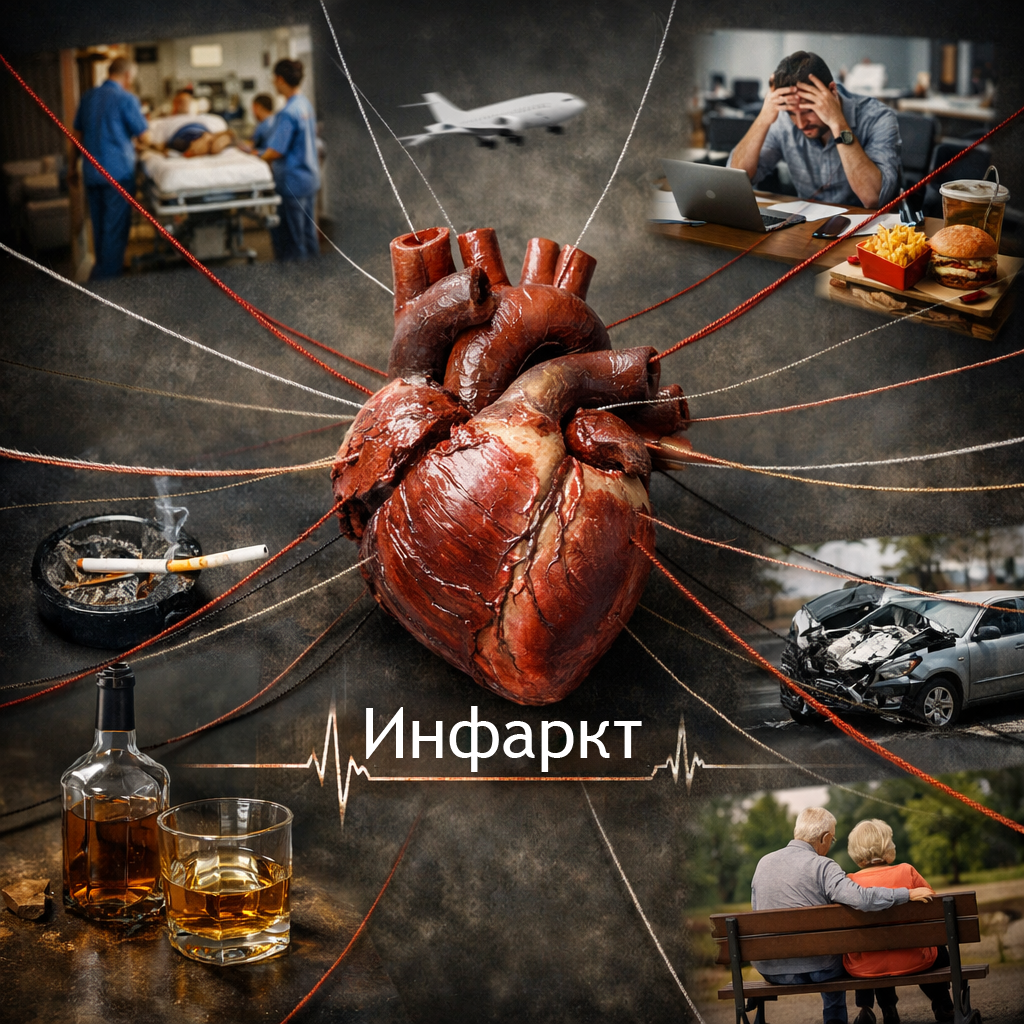 Самое важное - локализация Когда человек слышит слово «инфаркт», в голове почти всегда складывается катастрофическая картина - инвалид! Тем не менее, часто встречаются такие люди, на которых инфаркт вообще практически не отразился. От чего зависит исход инфаркта? В первую очередь от локализации - в каком именно сосуде случилась закупорка. Давайте сравним две полярные ситуации: инфаркт на главной магистрали и в небольшой артерии. 1. ПМЖВ: (один из трех главных сосудов сердца. По объему кровоснабжения - самый главный) ПМЖВ (передняя межжедудочковая ветвь) питает всю переднюю стенку левого желудочка, верхушку и большую часть перегородки. • Масштаб: При её закрытии выключается до 40–50% мышечной массы сердца. • Что чувствует сердце: Огромный дефицит ресурса. Если не восстановить кровоток как можно быстрее, на месте мышцы образуется очень большой рубец. И это не просто рубец, а аневризма. Что это такое, можно представить себе на примере растянутых и повисших «коленок» на школьных трениках.