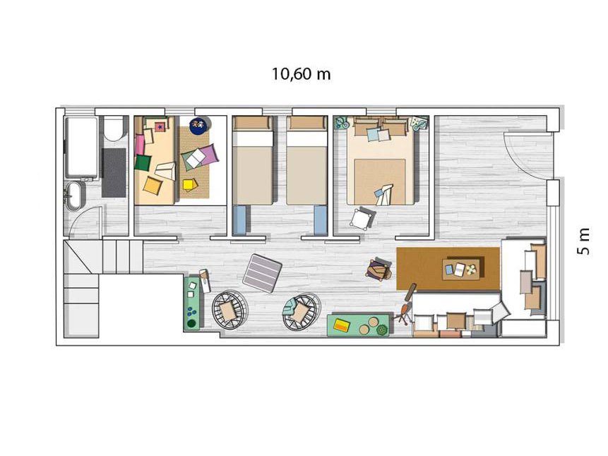 - Материалы и цвета. Визуальное разделение через отделку, текстиль, цветовые акценты.