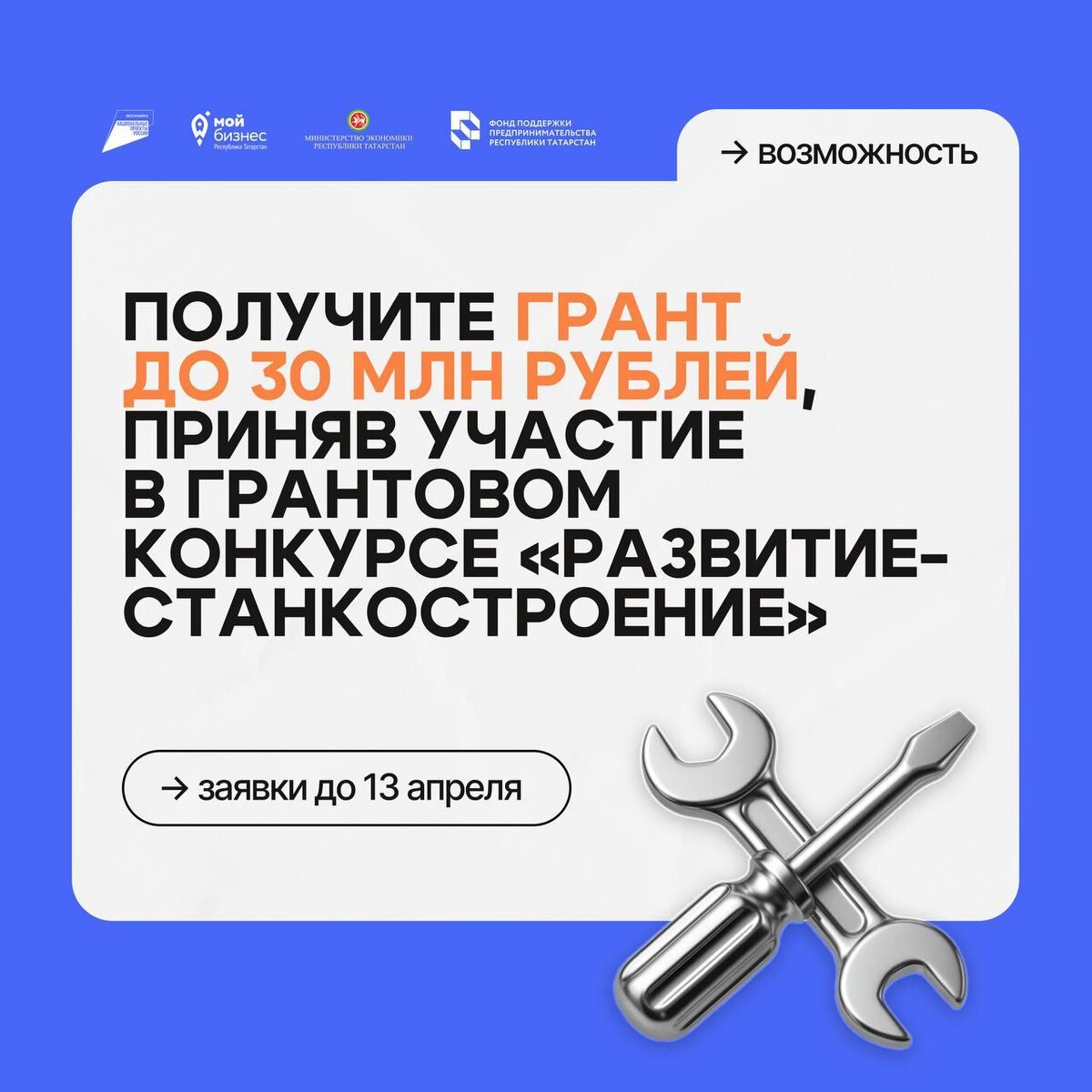 🛠 Фонд содействия инновациям объявляет о запуске новой очереди грантового конкурса «Развитие-Станкостроение» в рамках федерального проекта по развитию станкоинструментальной промышленности! Этот конкурс предоставляет уникальную возможность для малых предприятий, занимающихся научными разработками с высоким потенциалом коммерциализации. 🏆 Размер гранта составляет до 30 млн рублей при условии софинансирования не менее 15%. 🔍 К участию приглашаются юридические лица с опытом создания и вывода на рынок наукоемкой продукции, реализующие НИОКР по разработке новых образцов станкоинструментальной продукции. 📎 Проекты могут быть направлены на: • Разработку и создание металлорежущих станков с ЧПУ и обрабатывающих центров • Ключевые комплектующие для станков и промышленных роботов • Разработку критической номенклатуры инструментальной продукции • Аддитивное оборудование • Промышленные роботы и робототехнические устройства ⏳ Приём заявок продолжается до 13 апреля 2026 года! Не упустите возможно